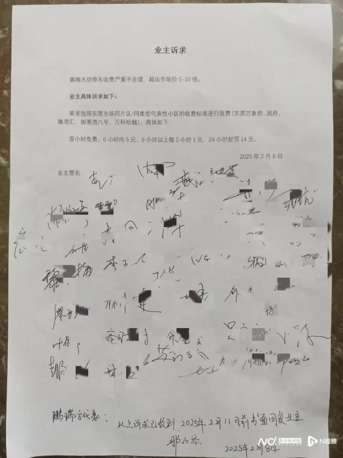 当天现场,鹏瑞天玥业主们对于停车费提出了诉求并集体签名,希望按照东莞市场同片区/同类型代表性小区的收费标准进行收费(东莞万象府、润府臻湾汇、御景湾八号、万科松樾),具体如下:首小时免费、6 小时内5元、6 小时以上每2 小时1元,24 小时封顶 14 元。“同类型小区收费标准月租是400元左右。”李先生如是说。