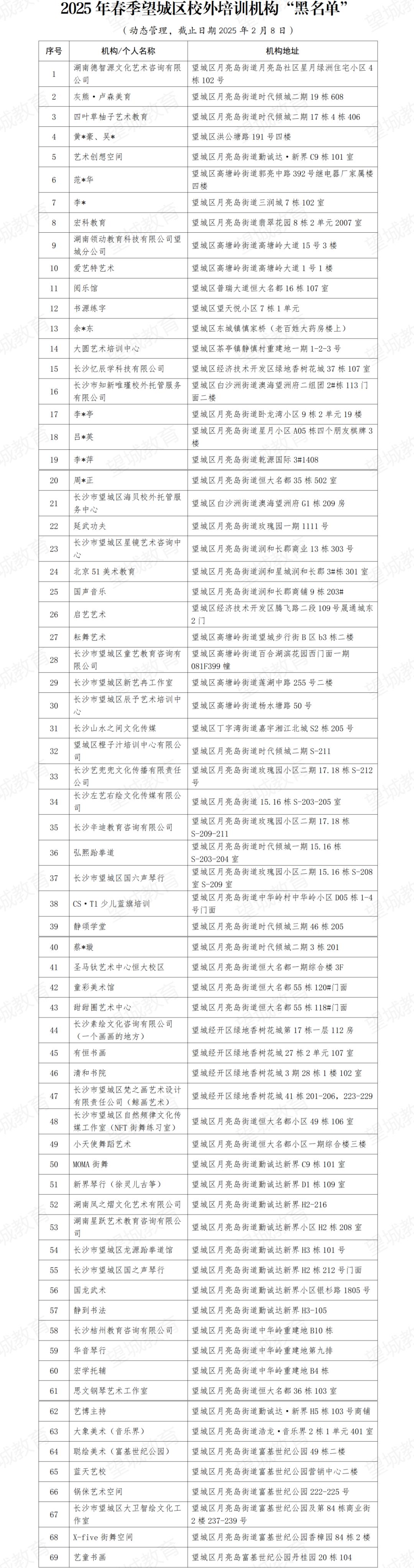 原标题:《2025年春季望城区校外培训机构“白名单”“黑名单”公布》