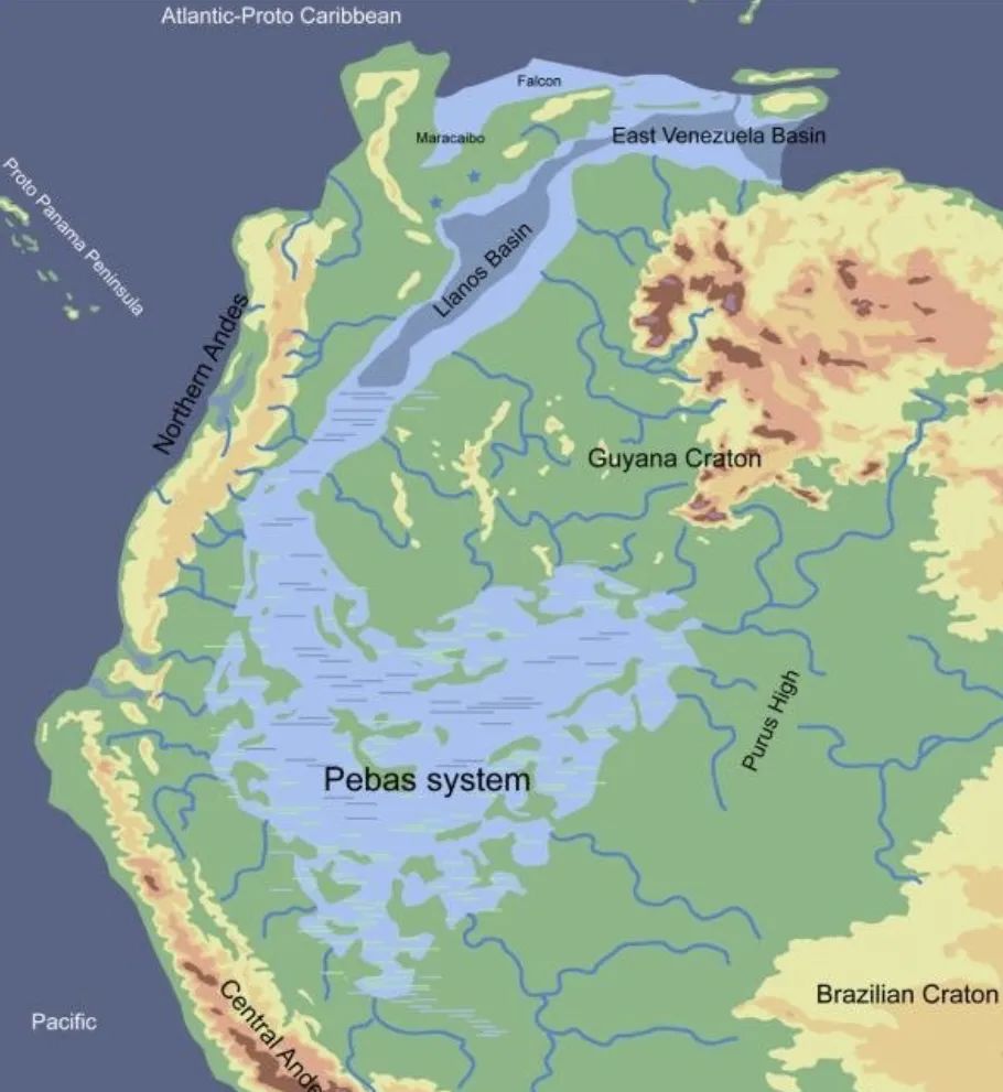 巨兽之地指的是2000万-530万年前佩巴斯湖,虽然以“湖”命名,但它不是真正意义上的一个湖,而是由一系列湖泊和湿地组成的潮湿地带,位于现在亚马逊雨林的西部。