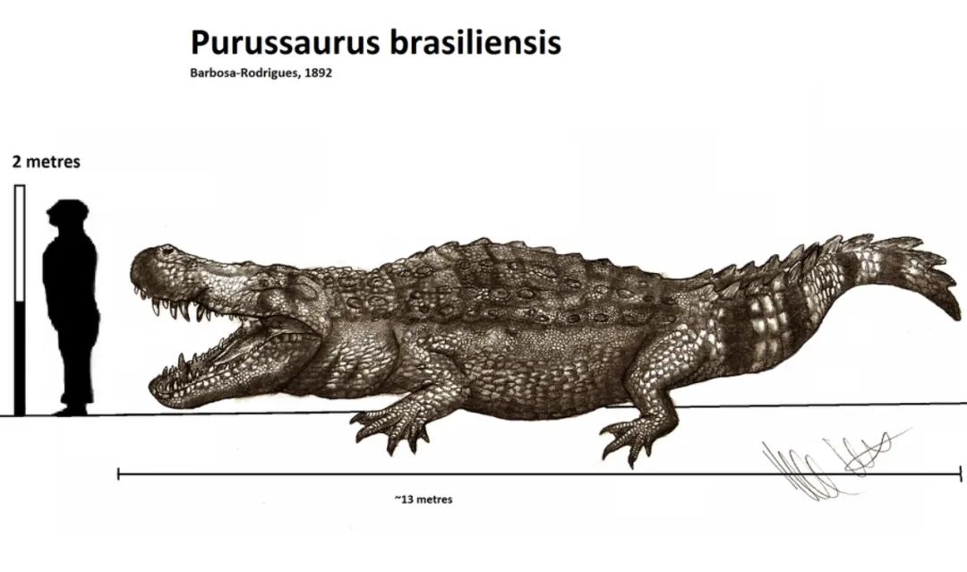 普鲁斯鳄(Purussaurus),这类鳄鱼被认为是有史以来最大的鳄鱼种类,它们是凯门鳄的一个分支,最大个体的体长能达到13米前后,体重超过8000公斤,咬合力是霸王龙的2倍,它们就是出自佩巴斯湖。