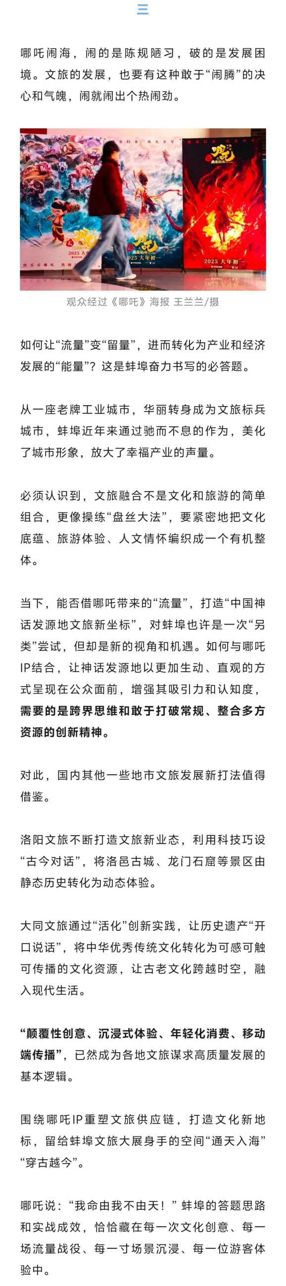 如何把哪吒泼天的“能量包”转化成蚌埠文旅长红的“大礼包”?为“皖C文旅”赋能的“混天绫”“风火轮”“乾坤圈”在哪儿?这给蚌埠这座幸运之城出了一道“脱胎换骨”的新命题。