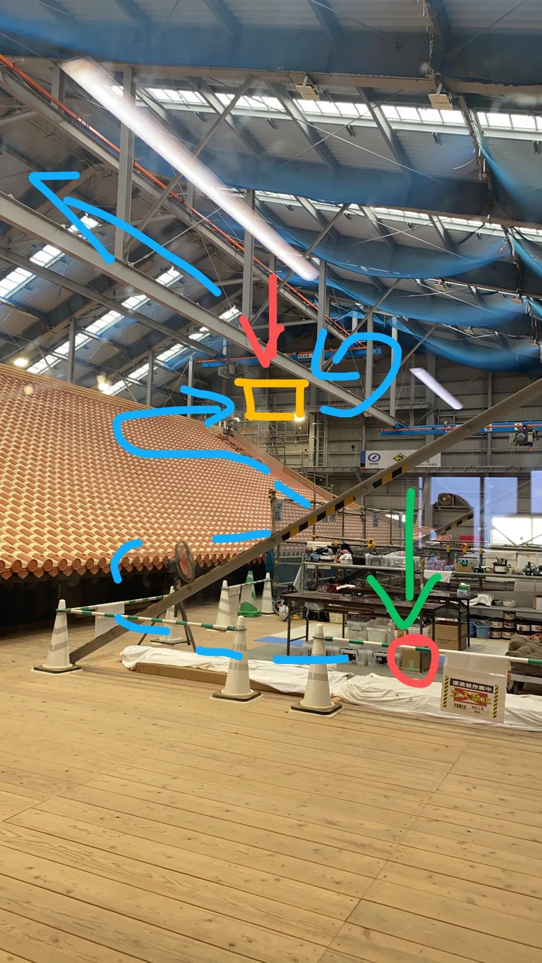 木造的正殿搭建过半,脚手架、小型起重设施、吊篮电梯、开关控制的电动拉门、材料区、工具收纳区井井有条地围绕在侧。古迹与现代基建设施并置,形成复杂而迷人的冲突结构。我拍下照片,坐在休息区的木凳上,在手机备忘录中涂涂画画地设计了一处潜行关卡,将工坊、上中下三层用两条主要动线串联起来,标出敌人和投放物的布置,并简短地写下关卡中的叙事。我把设计图保存到“灵感”文件夹,忍不住分享给了L和相熟的同事,却收获了他们两个几乎同时发来的“你在休假,禁止工作”。