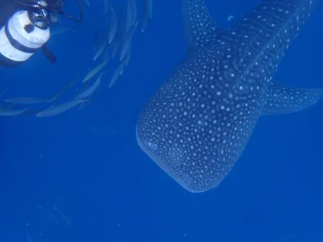 一瞬间,包围我的是一种巨大的静寂。船的引擎声,人们说话的声音,海浪声,一切声音都消失殆尽,连我自己的呼吸和心跳都被静寂所吞噬。曾经的生活空间仿佛从未存在过,空无一物的澄净之中,两条巨大的蓝色影子伴着一群暗灰色的散碎影子从我身体的右侧下方缓缓游过,那是鱼群和其中的两条鲸鲨,它们撒满白色斑点的身体优雅地飘然移动,如在真空中一般,不在周遭留下一点点经过的痕迹。此时我的大脑才明确地意识到,什么,原来我竟然已经潜进水里,与这些幻想般的生物真实地同在一处了。