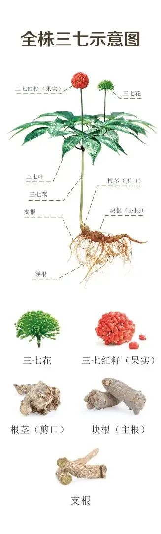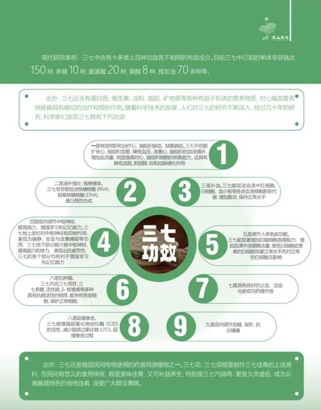 三七地上部分的三七花、茎、叶有清热解毒、平肝明目、生津止渴的功效,地下部分的三七根茎,有活血化瘀、消肿定痛的神奇功效,民间亦有三七“生打(撵)熟补”的说法,即三七生服用于跌打损伤,熟服用于补血活血。现代研究表明,三七中含有十多类上百种功效各不相同的有效成分。目前已知的单体皂苷就达150种、多糖10种、氨基酸20种、黄酮8种、挥发油70多种等,经过几十年的研究,科学家们发现三七具有九大功效。