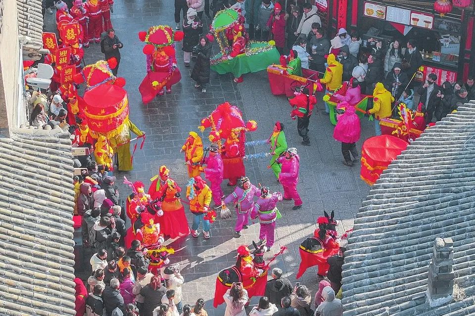 精彩纷呈的年俗表演吸引众多游客前来观赏。在节奏明快的锣鼓声中,舞狮队员配合默契,将醒狮的各种形态展现得淋漓尽致,辗转腾挪间,观众的欢呼声和掌声此起彼伏。秧歌、魔术、杂技、舞蹈等节目轮番登场。秧歌表演欢快喜庆,队员们身着盛装,手持彩扇,扭出欢度春节的精气神。二人摔跤、抖空竹、变脸等非遗民俗表演为游客送上了精彩的文化大餐,也将喜悦和幸福传递给现场每一位观众。游客张先生表示:“我是从社交媒体上看到这里过年很热闹,就特意赶过来打卡,果然没让人失望,感受到了满满的年味儿。”