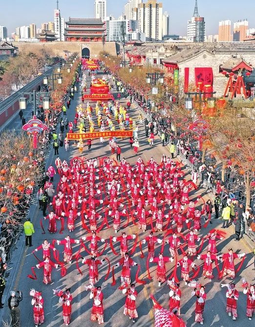 2月10日,农历正月十三,大同古城的民俗社火巡游表演盛大开启。挠搁、旱船、花伞及人偶互动等精彩节目纷纷亮相,为市民和游客带来一场视觉盛宴。刘通 张占兵摄太原玉泉山:文旅大餐扮靓美好生活