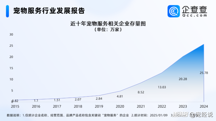 由于消费者对个性化、专业化需求的提升,宠物服务行业也迎来了前所未有的机会。近十年来,宠物服务相关企业的数量飞速增长,从2015年末的0.82万家一路攀升至2024年末的25.78万家。