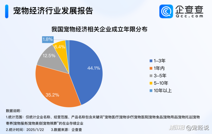 另值得注意的是,在当前国内宠物企业中,成立十年以上的企业仅占1.8%。这表明,宠物行业的企业大多处于较短的生命周期中,行业内的“淘汰率”较高。与此同时,归属于科学研究和技术服务业的企业数量仅有15.3万家,占比3.6%。这意味着,在研发和技术支持方面,行业仍显薄弱。