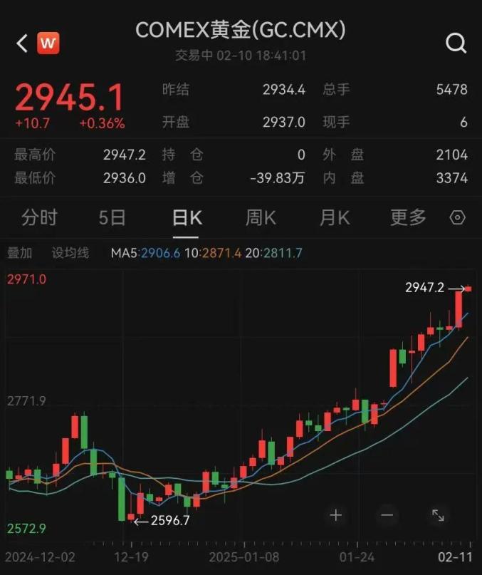 COMEX黄金期货也屡次突破历史高点。截至发稿,COMEX黄金期货也直线拉升,报2945美元/盎司。