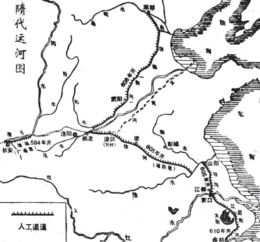 隋代大运河大业元年(605年)三月,炀帝命令尚书右丞皇甫议征发河南、淮北各郡的百姓,共一百多万人,开凿通济渠。从西苑引谷水、洛水到黄河,又从板渚引黄河水,经过荥泽入汴水,从大梁东面引汴水经过泗水到淮河。