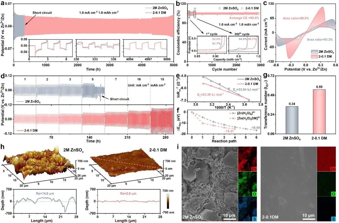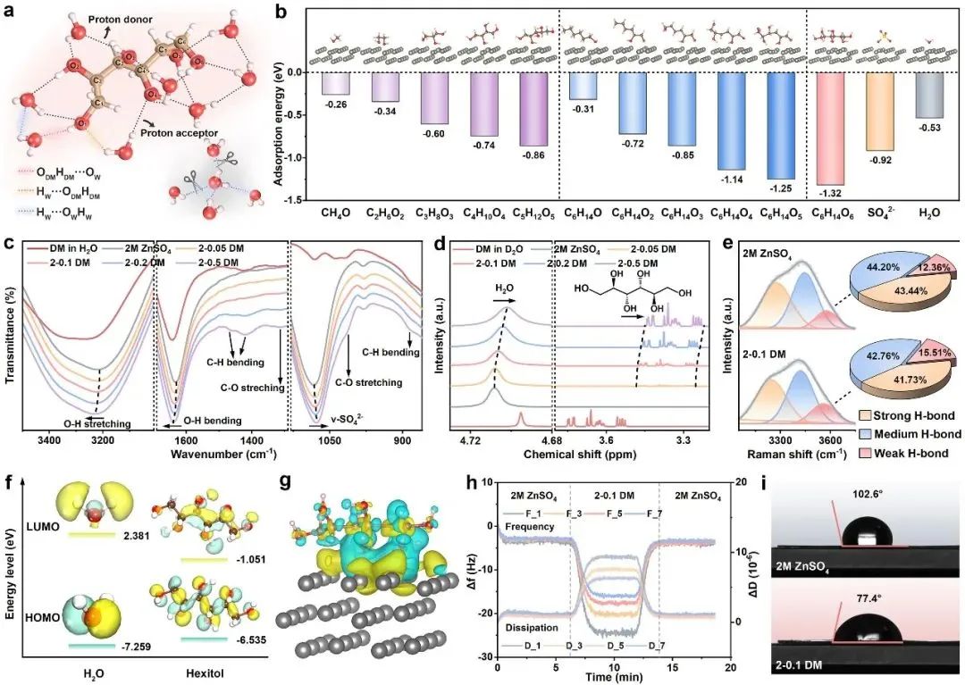 FTIR、Raman和NMR光谱表征溶剂化结构,DM与周围水分子形成偶极相互作用,破坏原有氢键结构,并通过提高水分子周围的电子密度降低了水活性。综合评估形核过电位、电化学阻抗、长循环稳定性和可逆性,确定了在2 M ZnSO4电解液中添加剂的最佳浓度为0.1 M(2-0.1 DM)。DFT计算结合石英晶体微天平(QCM)实验进一步确认了DM在锌电极表面可逆的平行吸附构型,并改善界面润湿性。