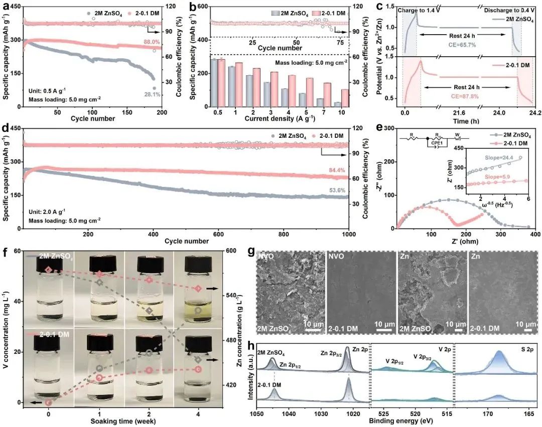 图3 不同电解液中锌沉积/剥离可逆性分析。六元糖醇添加剂同样调控正极界面,阻止质子迁移和水分子聚集,在高负载钒酸铵全电池中展现出优异的循环稳定性,有效抑制钒溶解,减少副产物生成,并保持正极结构稳定。