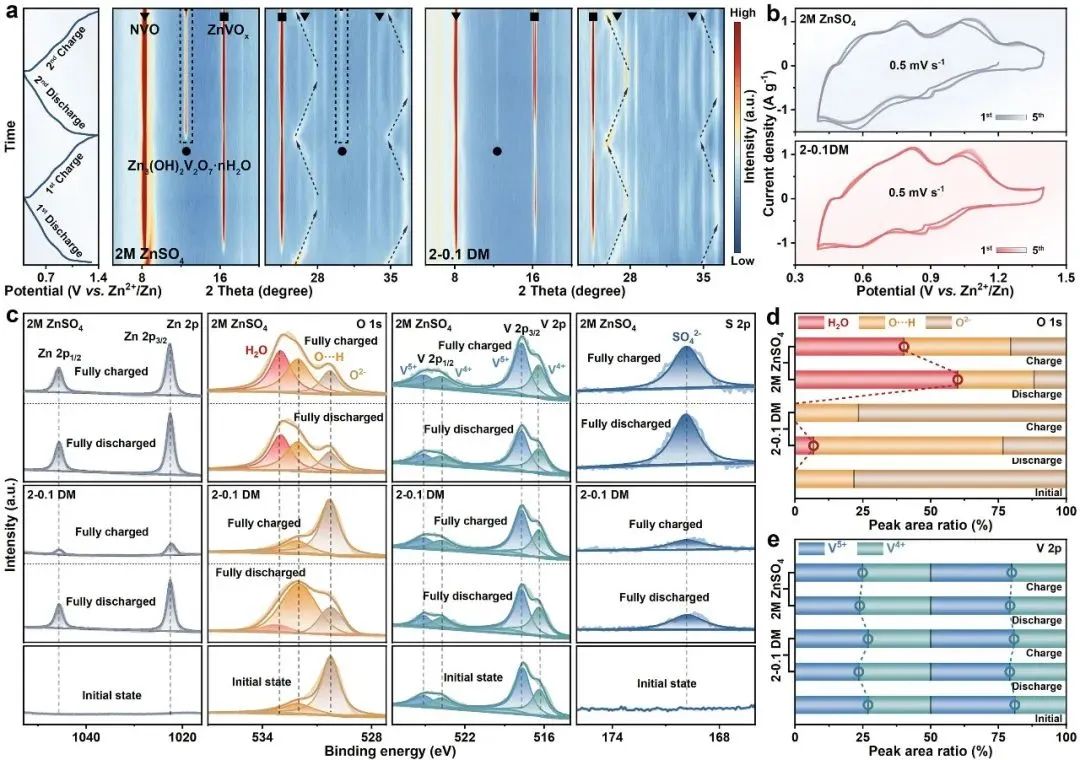 图4 Zn//NH4V4O10全电池性能。进一步探究了六元糖醇改性电解液对钒基正极储能机制的调控作用。原位XRD和非原位XPS分析表明,相较于传统ZnSO4电解液中Zn2+/H+/H2O协同嵌入导致的钒基结构大体积变化和不可逆相变,DM通过调节界面水分子配位,抑制质子传输和参与储能,构建以可逆Zn2+脱嵌为主的储能机制,减弱界面副反应,显著提升循环稳定性,为高效长寿命锌离子电池提供了新策略。