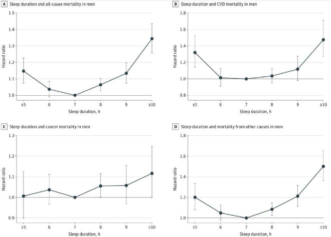 在男性中:与7小时的睡眠相比,每晚睡眠达到8、9、10小时,全因死亡率将分别升高9%、18%和43%;而如果睡眠不足5小时,全因死亡率也会升高16%。