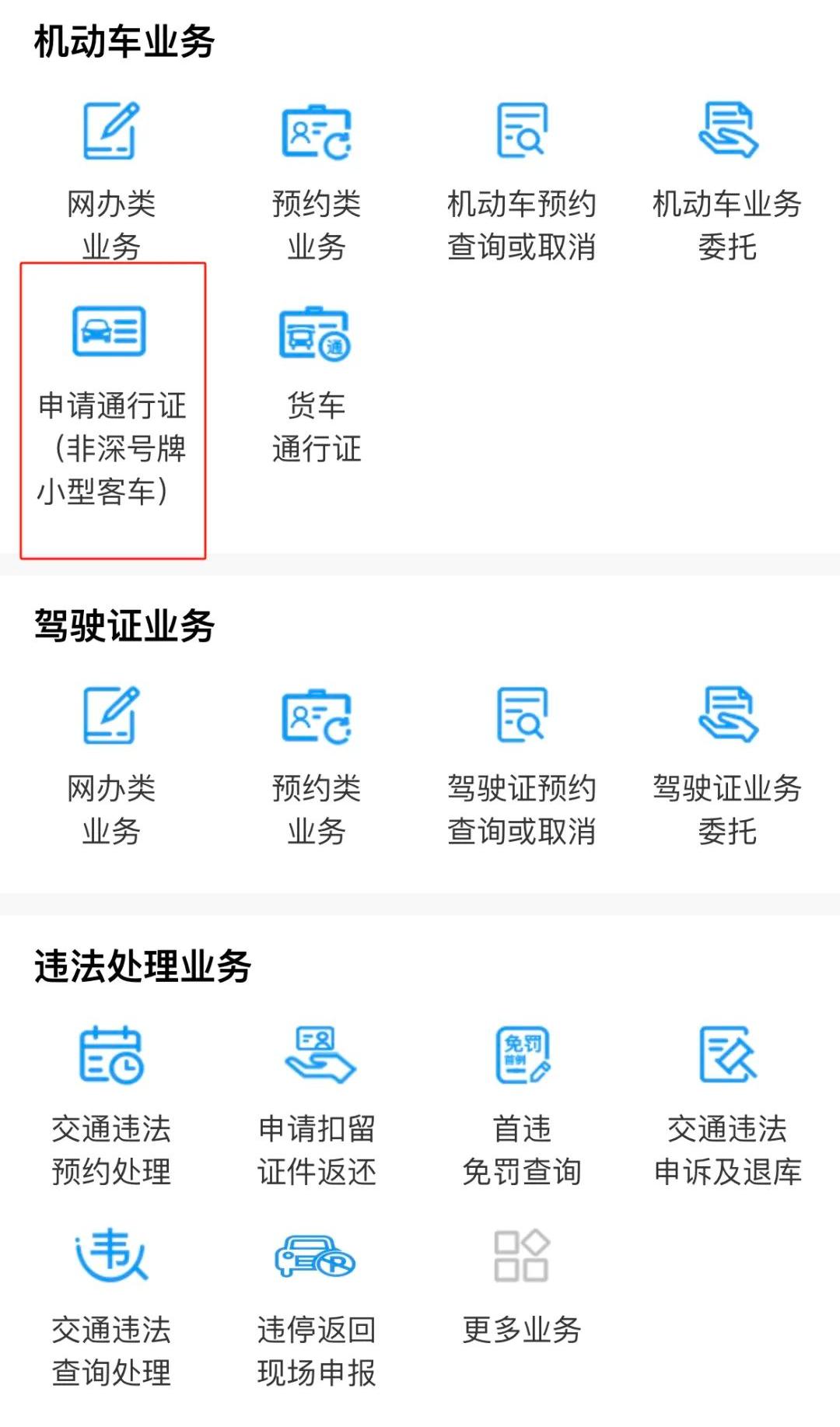第三步:选择机动车业务中的“申请通行证(非深号牌小型客车)”。