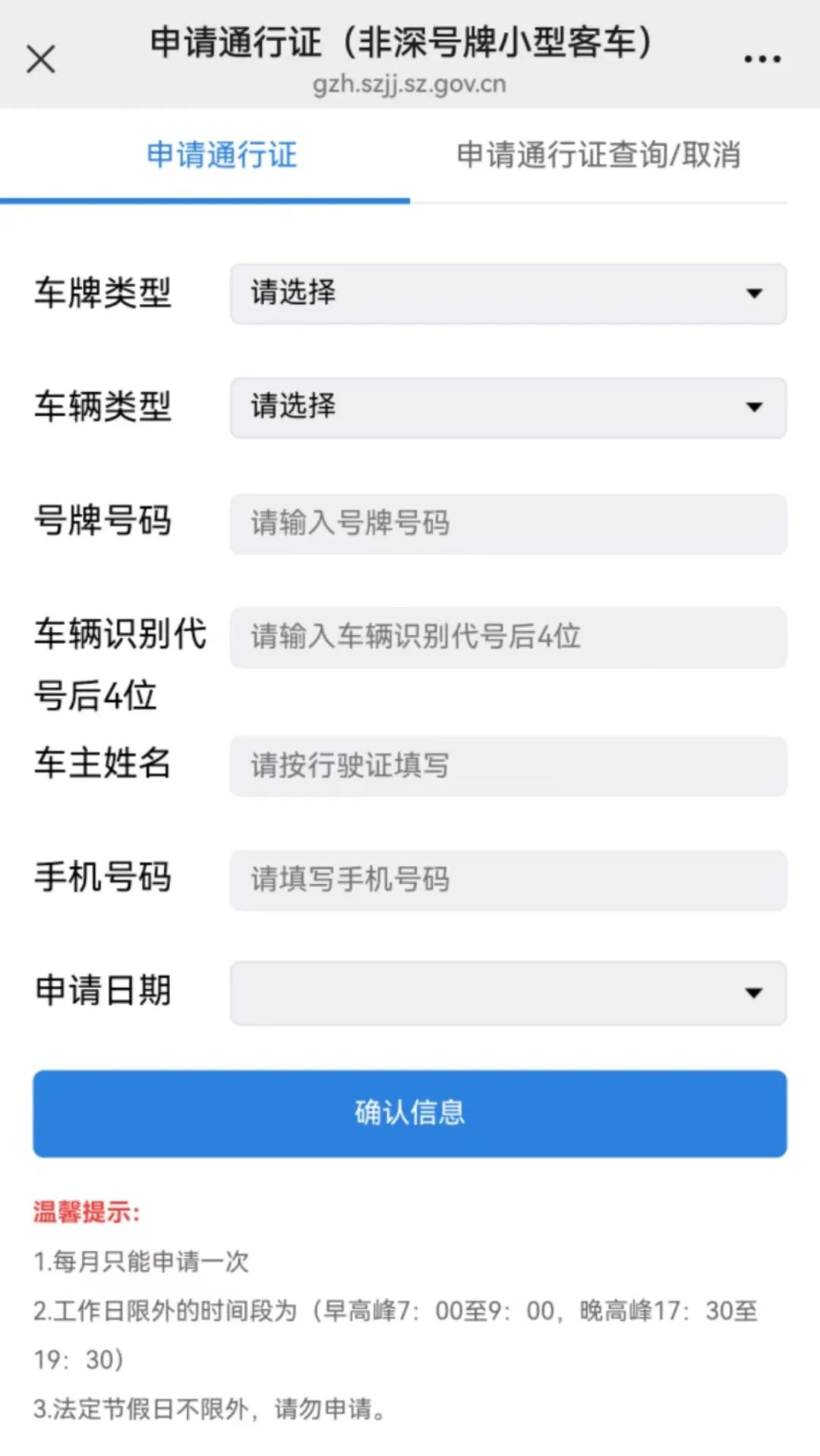 第四步:输入车主姓名、手机号码、车牌号码等信息,然后点击确认进行申请。