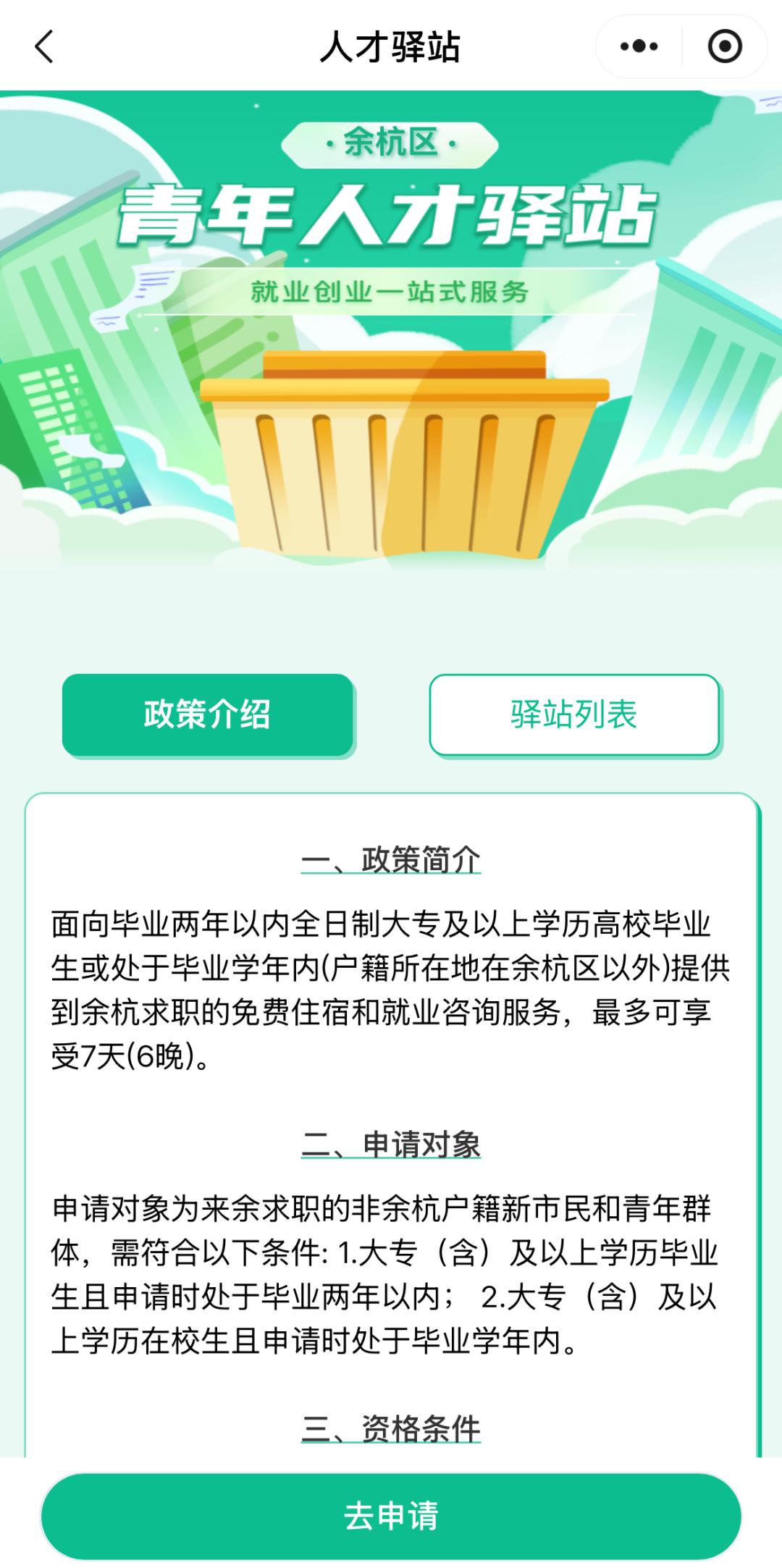 申请对象为来余求职的非余杭户籍新市民和青年群体,需符合“大专(含)及以上学历毕业生且申请时处于毕业二年以内“或”大专(含)及以上学历在校生且申请时处于毕业学年内”。