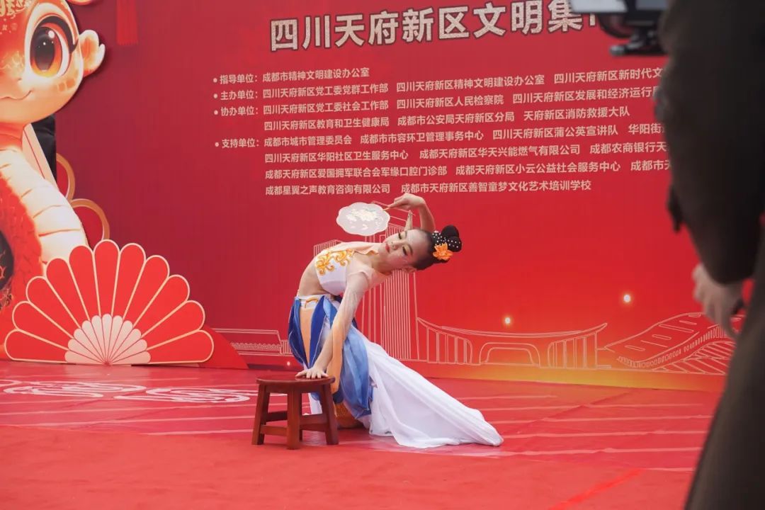 舞台区域同样精彩纷呈,舞蹈《大红灯笼》《舞韵丝路》、京剧《武生》等节目轮番上演,为观众带来了一场视听与心灵的双重盛宴。同时,天府新区蒲公英宣讲队《文明微宣讲》以生动的形式传递了文明理念,华阳街道“向阳少年宣讲队”的《文明之光耀蓉城,向阳少年启新程》宣讲,展现了新时代青少年的责任与担当。