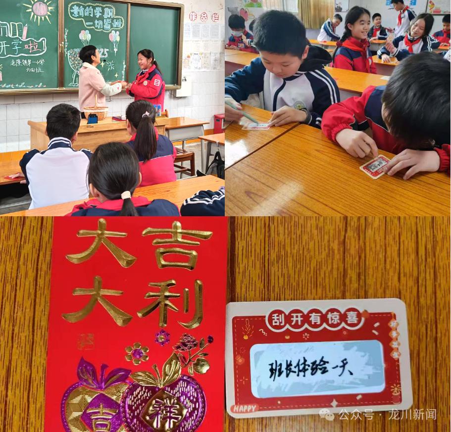 在龙川县老隆镇第一小学,同学们满怀欣喜,重返校园,沉寂了一个假期的校园再次充满了欢声笑语。班级里,老师们精心准备了一个个装有刮刮卡的“红包”,新颖又创意十足的开学仪式让同学们欣喜万分。打开“红包”,是老师们亲手制作的精美刮刮卡,体验一天班长、写夸奖纸条、奖励文具、自带零食……每一个“红包”都是一份惊喜,寄托着老师们对学生的殷切期望。同学们互相分享着自己收到的“红包”,欢声笑语在教室里久久回荡。这小小的“红包”,不仅是一份开学礼物,更是老师对全体同学深深的关爱和鼓励,它让大家在开学的第一天,就感受到了班级的温暖和集体的力量。