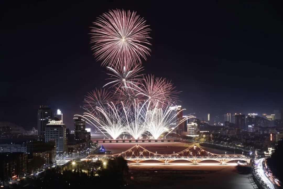 “灯火映七色 春韵焕山城”2025年通化市“龙兴里之夜”元宵节焰火晚会在市区红旗桥绚丽启幕。
