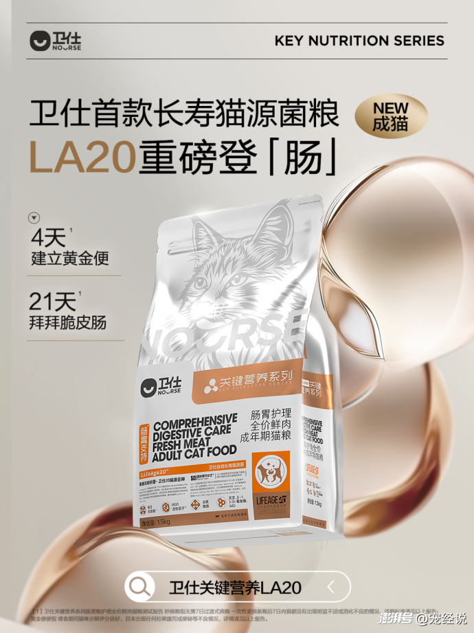 而已有20多年历史,建立起「千百十」医研级宠物营养研发标准的“中国宠物营养领先品牌”卫仕,则在去年10月发布了花1000余天自主研发的卫仕关键营养LA20猫粮”系列,以独家专研配方搭载自培长寿猫源益生菌 LifeAge20,帮助猫咪构建稳定的肠胃微生物环境旨在为不同年龄阶段的猫咪提供肠胃健康的科学喂养方案。