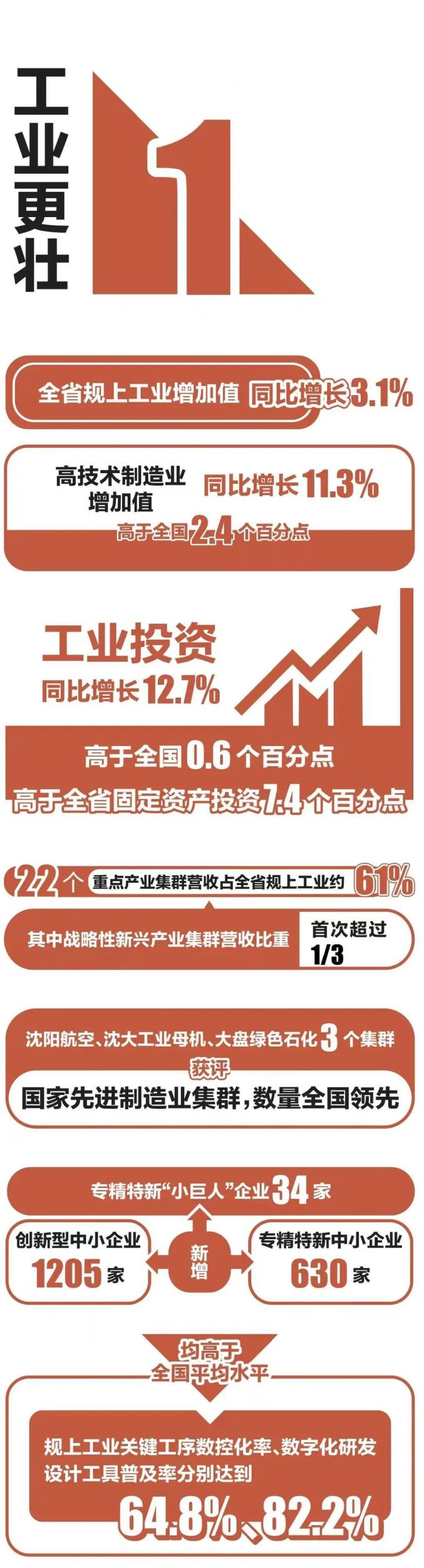 数字是最好的见证,沉甸甸的“成绩单”来之不易:2024年辽宁GDP增速5.1%,连续8个季度赶上或超过全国水平;全省固定资产投资增速达到5.3%,高于全国2.1个百分点,创10年新高;全省研发投入增速6年来首次超过全国水平,投入强度创10年来新高;全省高技术制造业增加值增长11.3%,高于全国2.4个百分点;社会消费品零售总额增长4%,连续22个月高于全国。