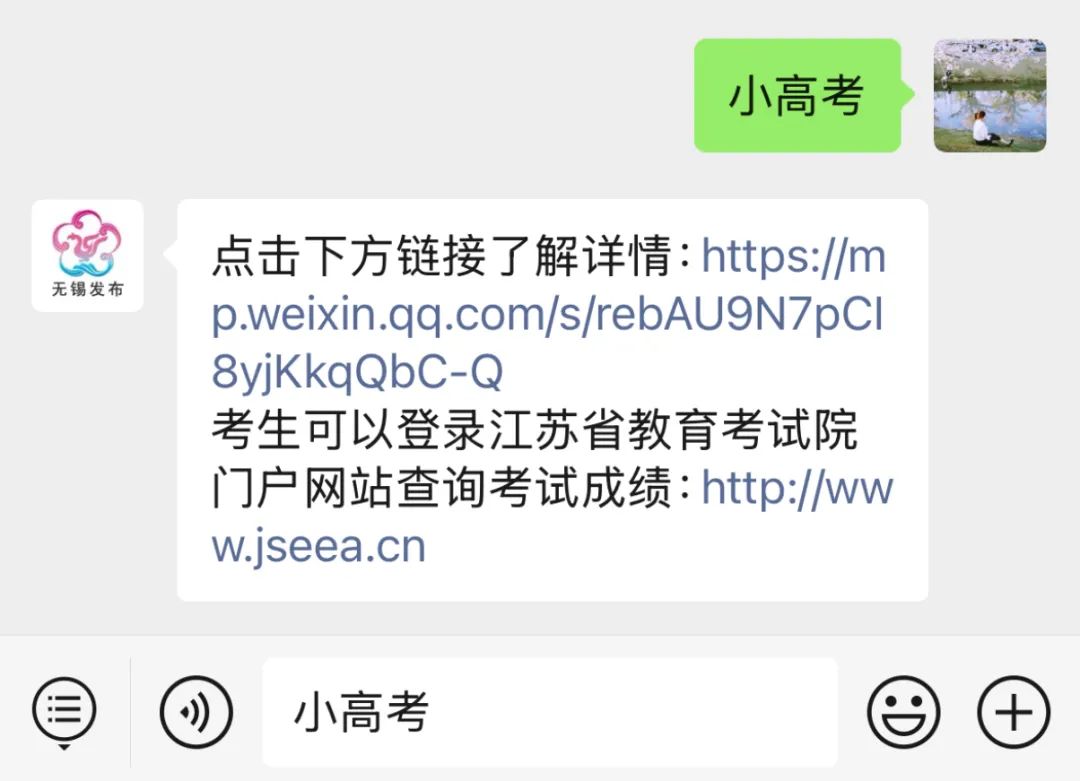 2、进入“无锡发布”微信公众号主页,在对话框回复关键词“小高考”;