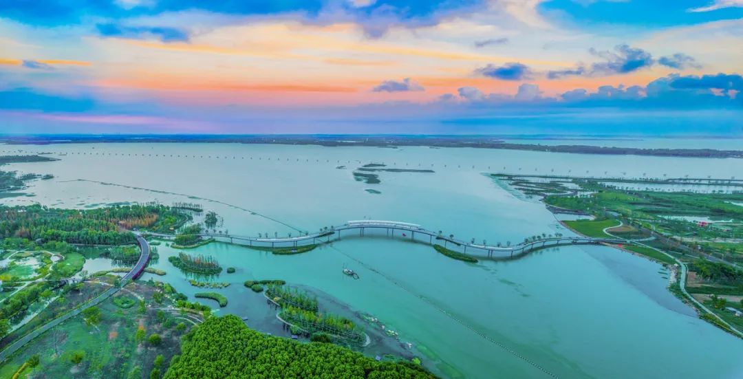 作为示范区内连接沪苏两地的标志性桥梁,凌空望去,桥身宛若一条凌空飞舞的绸带静卧在元荡湖面,将元荡湿地景观与环湖绿道串联起来,兼具功能性与艺术感,是摄影爱好者的热门取景地。桥面划分慢行、骑行与停留区,骑行时可俯瞰湖光潋滟,体验“一步跨两省”的独特趣味,也可远眺沪苏湖高铁列车飞驰而过的景象。