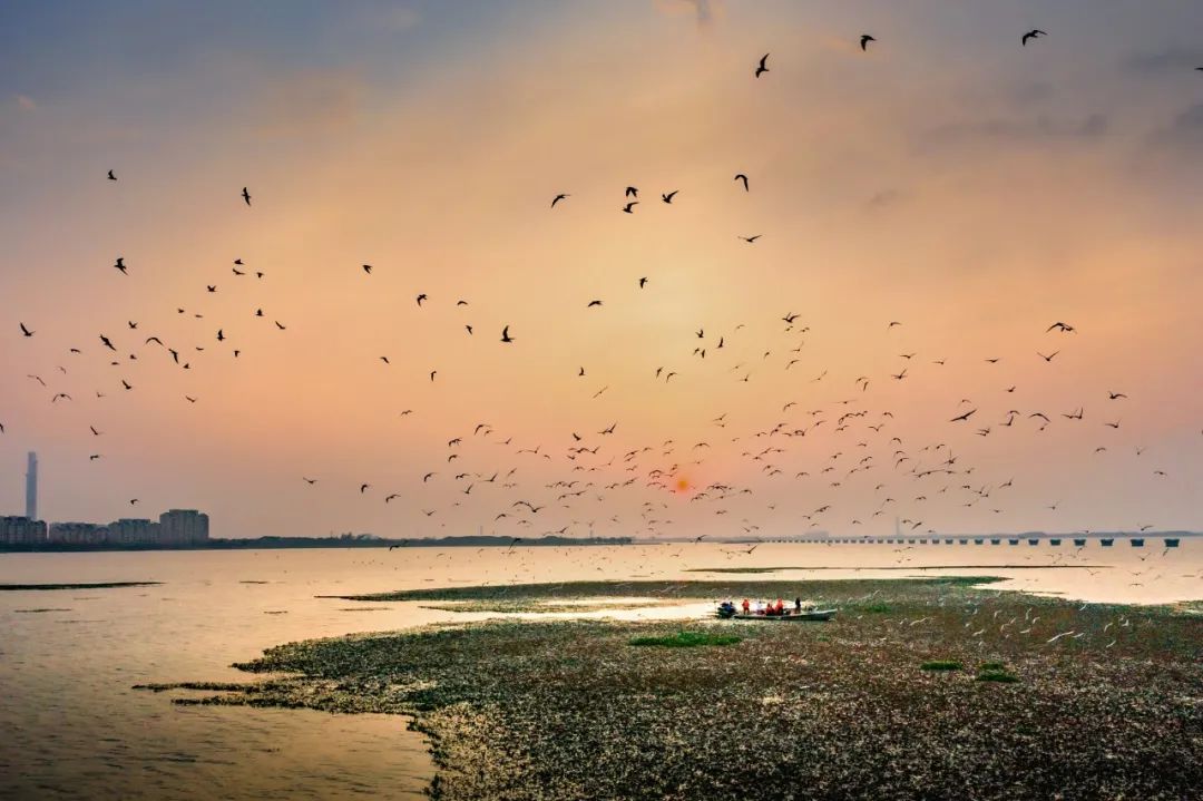 退渔还湖形成的12个生态湿地小岛,通过栈桥串联,成为白鹭、野鸭等鸟类的栖息地。骑行至湿地观测点,可近距离感受生物多样性之美。