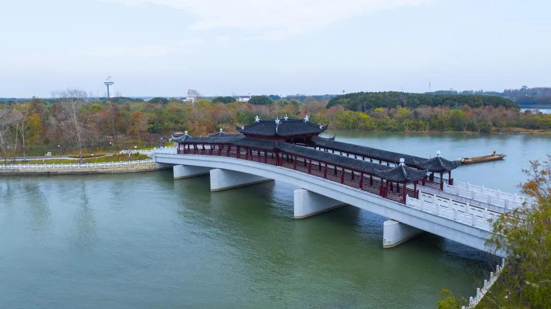 廊桥整体设计古朴趣味,是元荡岸线的标志性景观桥。骑行至此可停留片刻,听风赏湖,静静品味清幽雅致的古典园林意境,感受上海大观园的红楼梦文化。