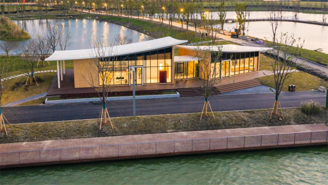 驿站内提供地图导览、充电桩及医疗急救包;小馆则以湖畔咖啡厅形式运营,供应轻食与饮品,落地窗设计让骑行者可一边休憩一边欣赏湖景。