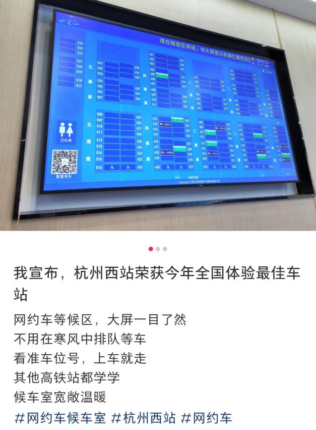 进入杭州西站网约车等候区,大厅宽敞明亮,智慧大屏一目了然。网约车到达停车场,智慧大屏第一时间就会显示出车辆所在位置,乘客找车、上车都轻松无比。