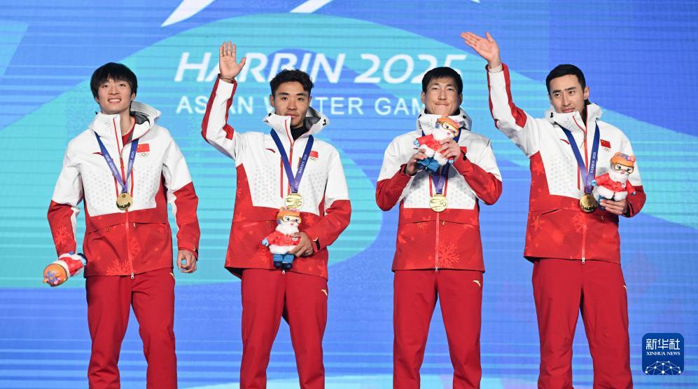 巴亚尼·加林在颁奖仪式上2月12日,上体竞技运动学院2022级本科生次仁占堆、2023级本科生李明林,与队友们获得亚冬会越野滑雪男子4×7.5公里接力金牌。
