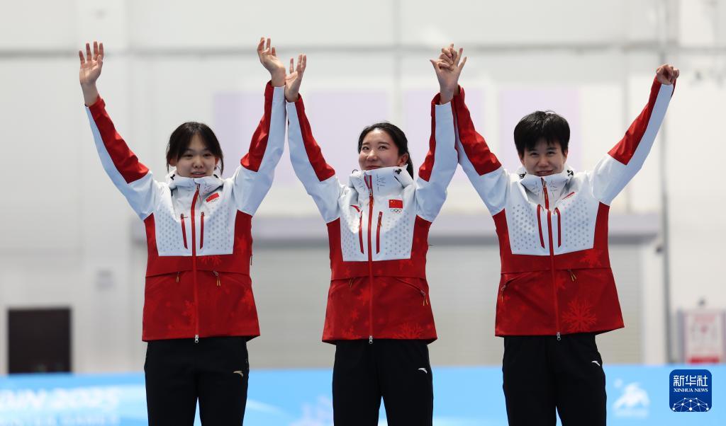 于婧萱(左)在颁奖仪式上2月9日, 竞技运动学院2024级本科生于诗惠与队友获得亚冬会速滑女子短距离团体追逐赛银牌。
