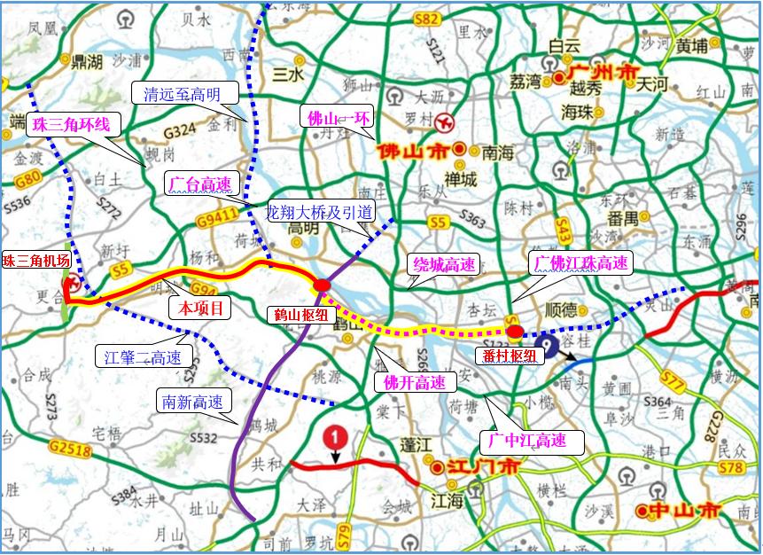 项目起点接南新高速古劳镇,向西依次经过佛山市南海区西樵镇,高明区荷城街道、杨和镇、明城镇、更合镇,终点位于肇庆市高要区蛟塘镇,全长约47.089公里,设计速度100公里/小时;全线互通立交6座(另规划预留2处)。