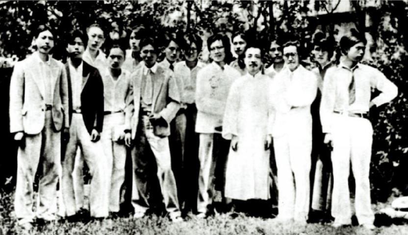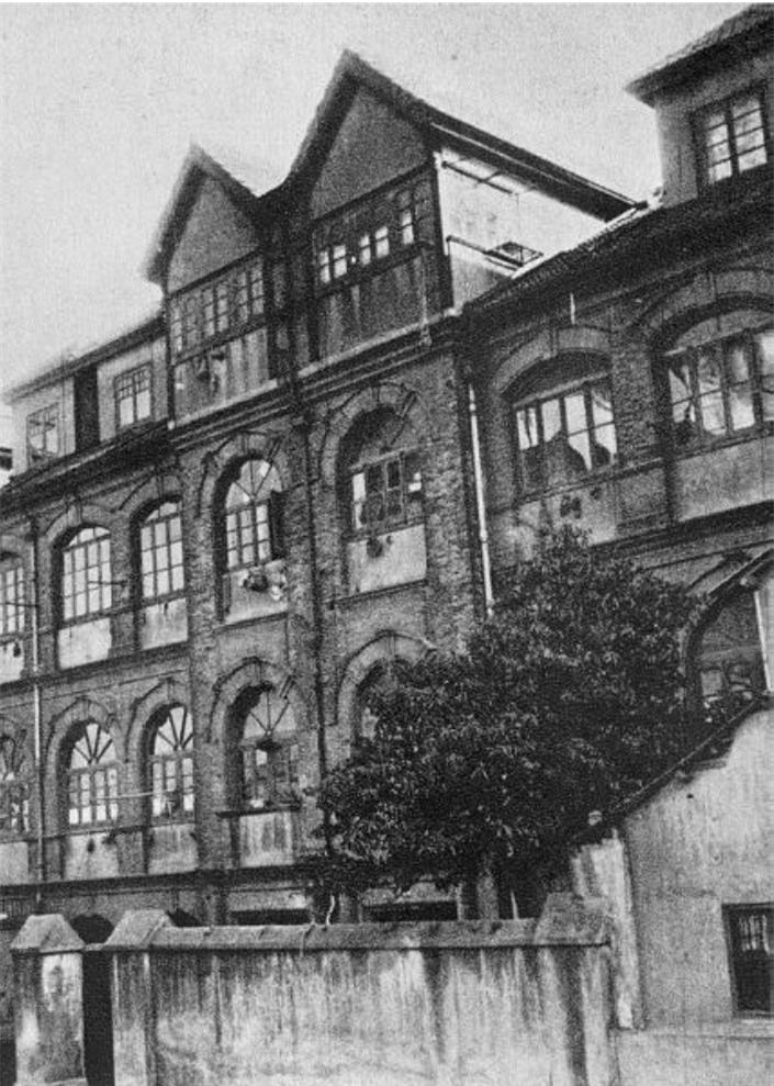 △鲁迅、内山嘉吉与木刻讲习会学员合影木刻讲习所旧址建筑由沙逊华懋地产公司建造,建于 1928 年。砖木结构假四层,坐南朝北,联列式,红瓦双坡顶。清水青砖外墙,嵌拱形红砖窗套,砖工细腻。东立面山墙具有荷兰式建筑风格。
