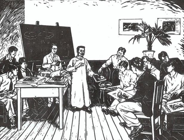 △李桦版画作品《鲁迅在暑期木刻讲习会上》