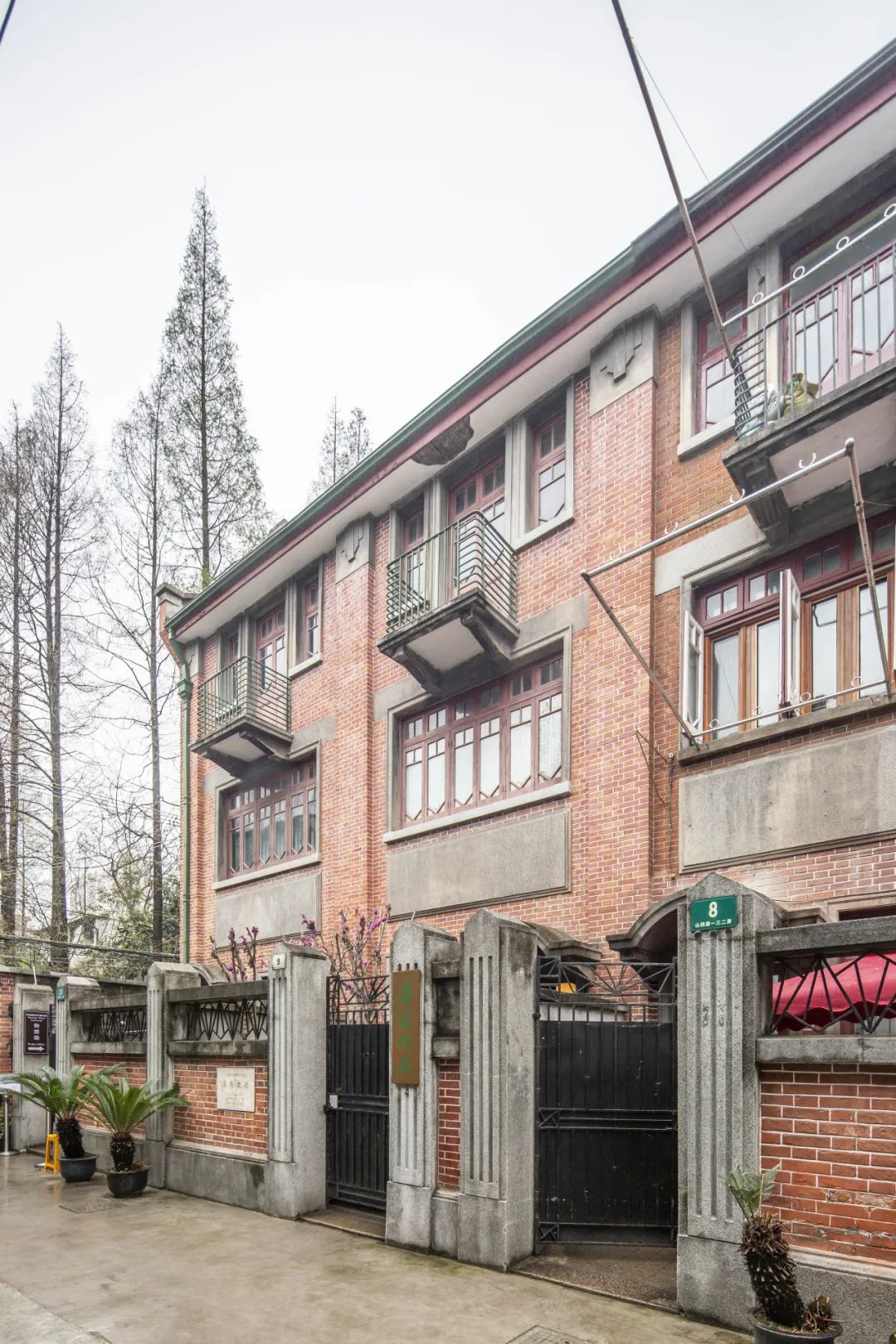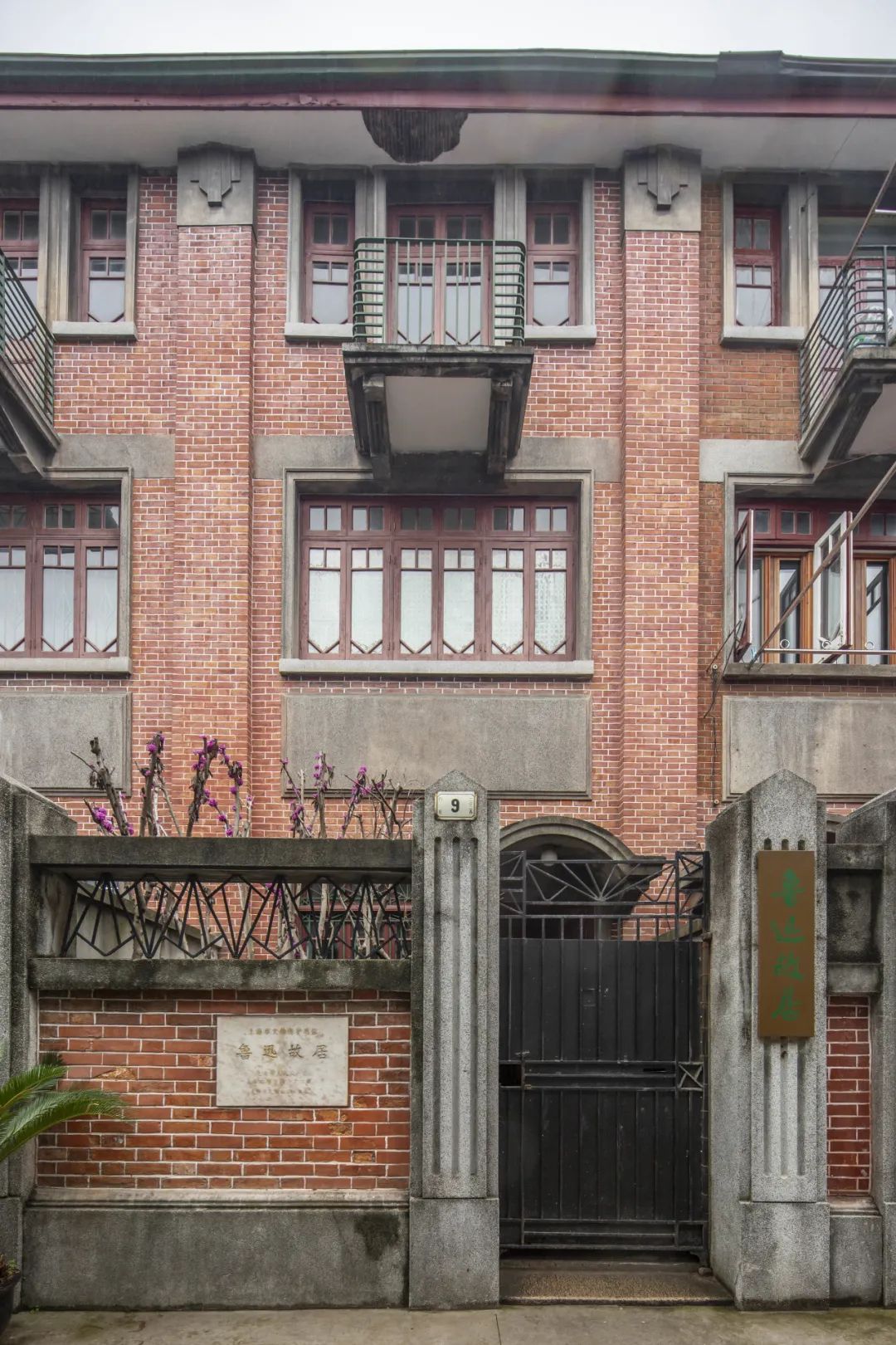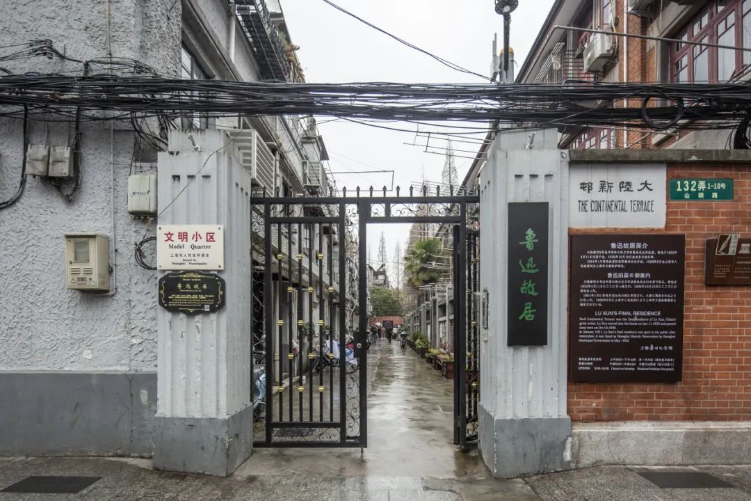 △ 山阴路132弄入口鲁迅故居所在的弄堂原名大陆新邨,由基泰工程司的罗邦杰设计,大陆银行上海信托部投资建造,砖木结构,1932年竣工。大陆新邨共有六条里弄,为新式里弄住宅,建筑外墙均为清水红砖墙,窗间墙设壁柱,三层设挑阳台,木门窗。每单元均有小院,矮围墙,铸铁栅门。