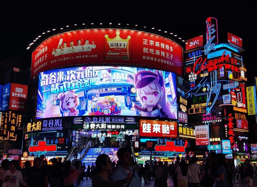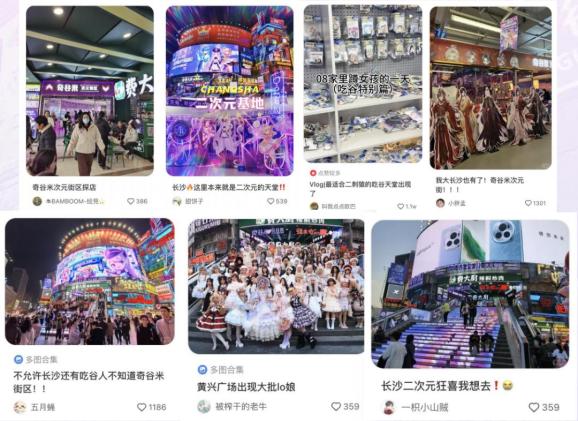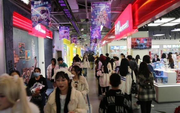 在位于天心区黄兴南路步行街中心广场的奇谷米·次元街区,各个“谷子”店人头攒动,“吧唧”(徽章)、手办、卡片、立牌、挂件、娃娃等二次元周边琳琅满目,激昂的动漫主题曲响起,身着二次元服饰的coser随处可见,合影快门声不绝于耳,仿佛日本的“秋叶原”。这里汇集众多热门IP、谷子集合店、漫展合作伙伴,打造了IP共生体系,形成了覆盖IP周边贩售、主题餐饮、沉浸式娱乐及圈层互动为一体的生态模式,成为城市的新地标,吸引了众多二次元爱好者前往打卡。