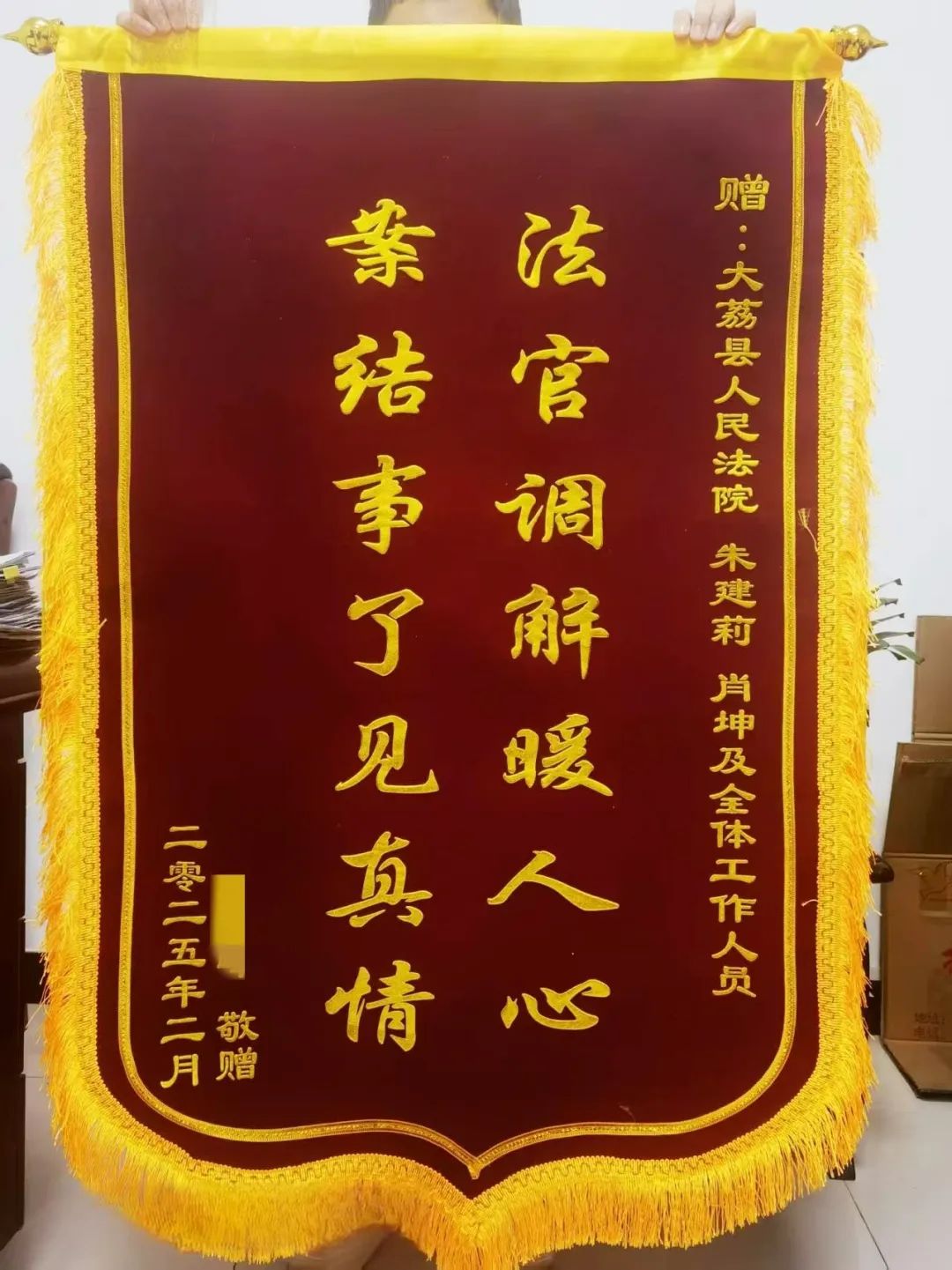 2月17日,大荔县人民法院速裁审判庭收到一面印有“法官调解暖人心 案结事了见真情”的锦旗,这面锦旗不仅是对速裁审判庭工作的认可,更是大荔县人民法院践行“司法为民”理念的生动诠释。