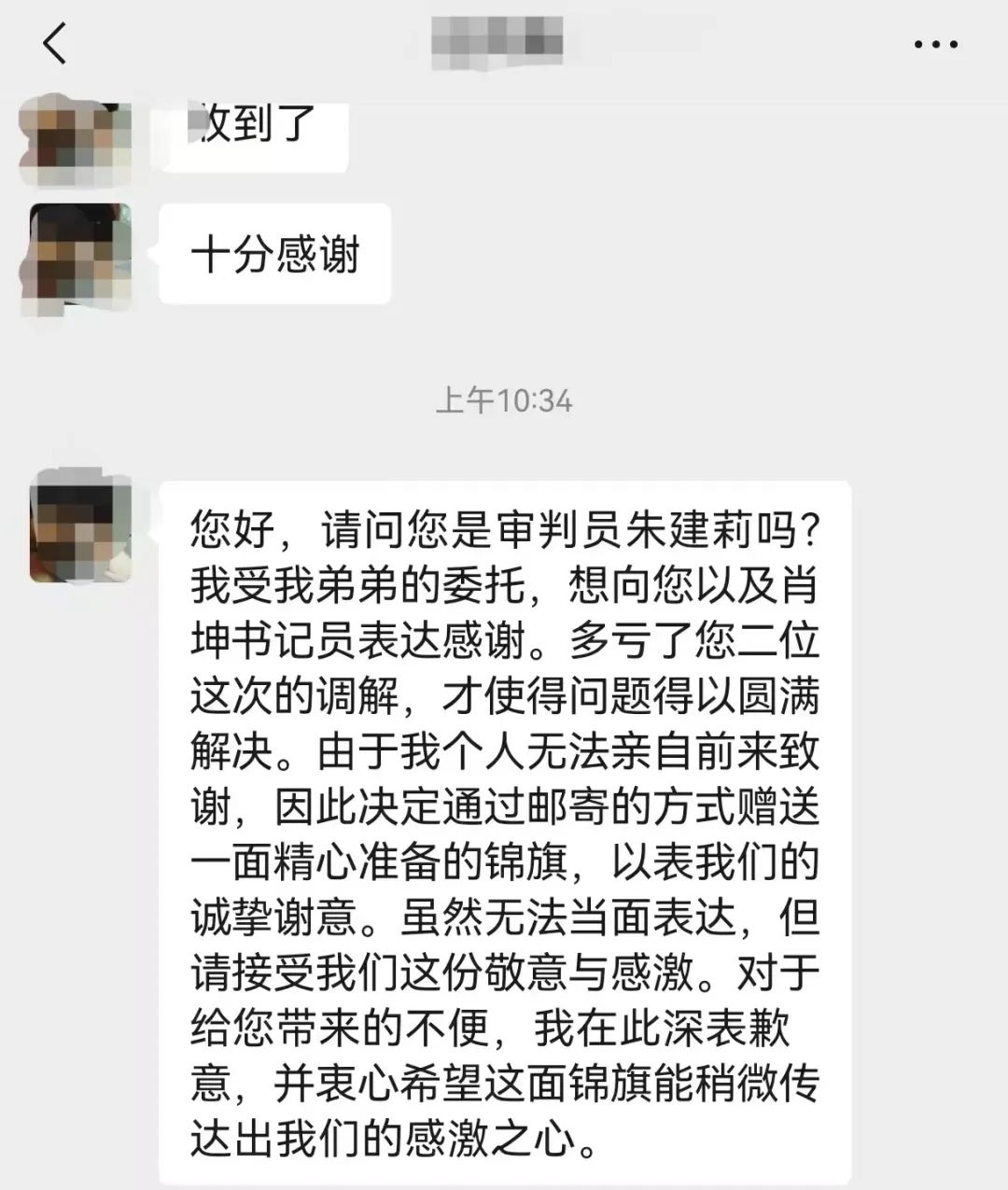 该案审理过程中,法官干警始终秉持“如我在诉”的司法理念,站在当事人角度给予充分理解和帮助,使用线上平台等尽可能减少当事人诉累的方式,最终让案件圆满解决。原告左某为表其谢意,向法官干警邮寄了锦旗,并附赠感谢信:“由于身体残疾,我无法像常人一样手写感谢信,只能打印这份信件来表达心意……贵院工作人员用实际行动诠释了“司法为民”的深刻内涵,让我在苦难中感受到法律的公正和司法机关的担当。”一面锦旗,一份信任,一份荣耀。大荔县人民法院速裁审判庭以实际行动践行“努力让人民群众在每一个司法案件中感受到公平正义”的庄重承诺,切实为弱势群体解决难题。速裁审判庭将继续在每一个案件中深化便民服务举措,让法治阳光照亮更多需要关怀的角落。