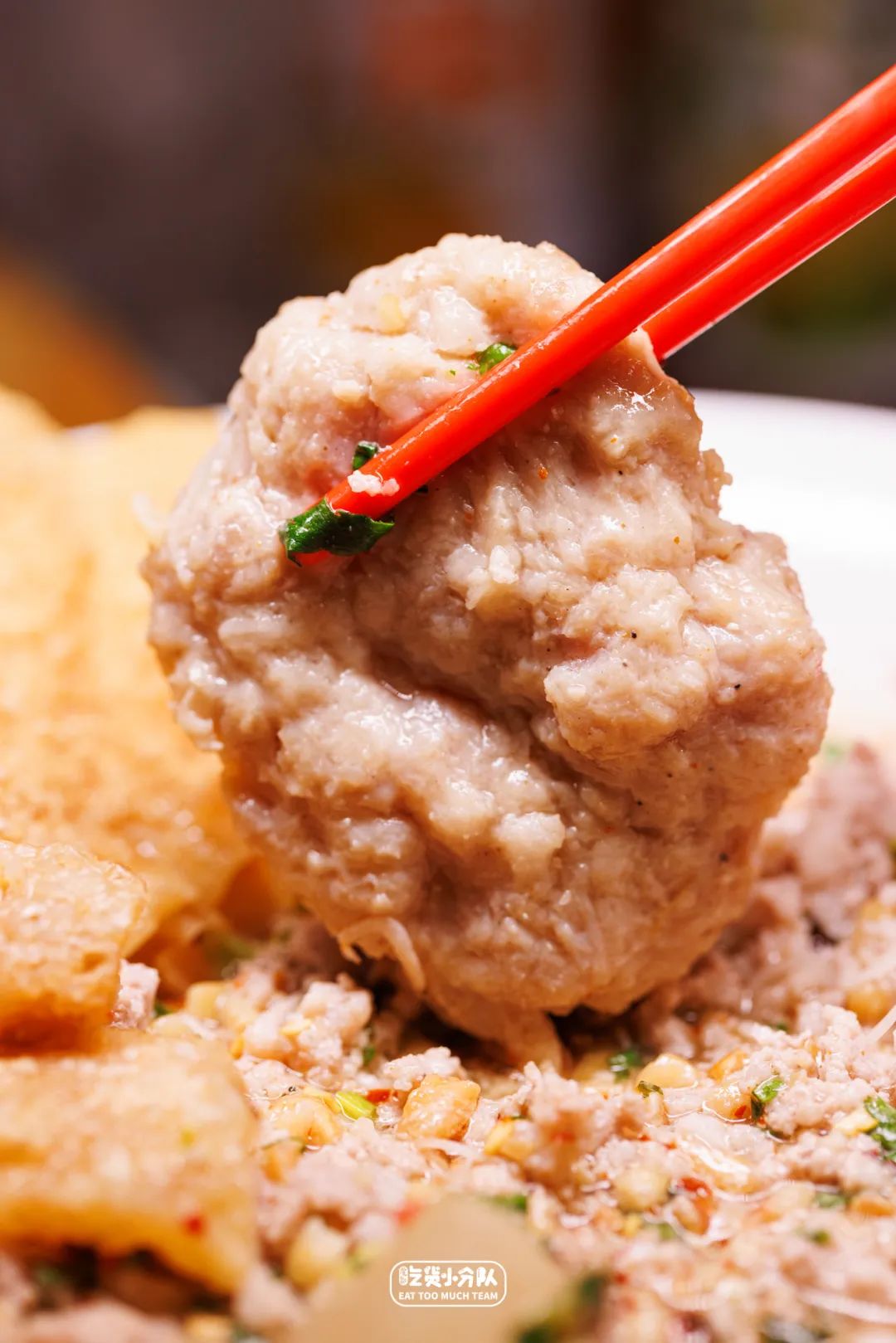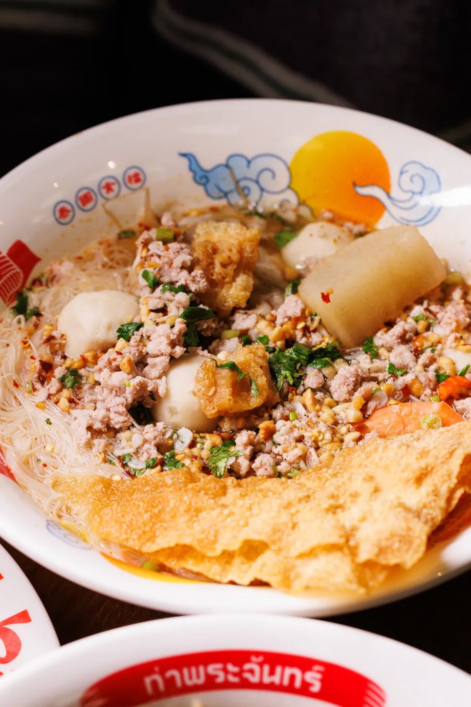 以猪骨吊好的高汤形成“鲜味”基因,添入店里自己熬的灵魂鱼露酱,花生、虾米融入汤底带出更多鲜味;酸味来自新鲜青柠与泰式醋酸;青柠与泰国小米椒的鲜辣碰撞带来醒神的酸爽;将肥瘦相间的猪肉舂碎爆香,铺成满满一碗,增加汤头的肉脂香气。这1碗融合了泰餐中经典的“酸、辣、甜、鲜平衡”,爽口开胃,可以分分钟喝到汤都不剩。(友情提醒:趁热大口嗦粉,不然细粉会把汤汁都吸光)
