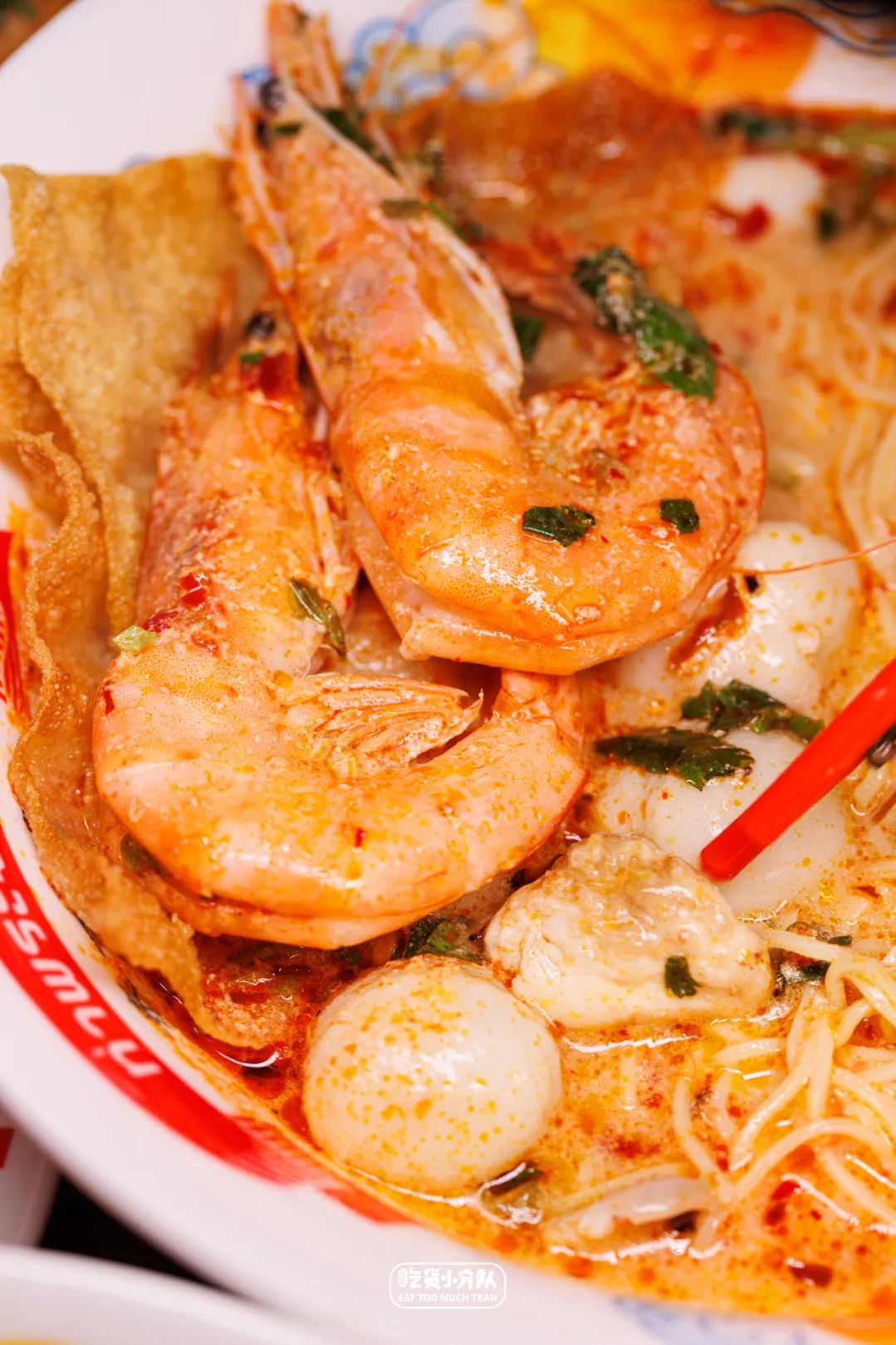 泰国小米椒、自制鱼露酱、临出锅前挤入的新鲜青柠汁,都是美妙味觉的催化剂;融入椰浆既柔化辣度又能增添奶香,它家的冬阴功是非常标准、原汁原味的泰式酸辣。忍不住夸夸这人见人爱的竹升面,即使在汤里泡了很久也不会坨,反而筋道而入味。以爽滑的竹升面和浓烈的汤头,辅以大虾、小鱼丸的海味,组成了超地道的泰式味觉指南。