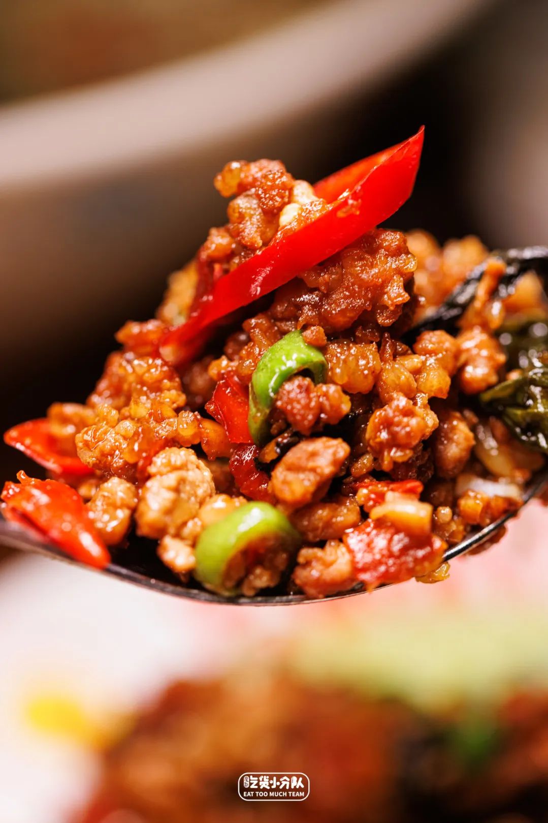 打抛叶入锅前轻拍释放香气,融入肥瘦比3:7的猪肉沫,与切碎的泰国小米辣猛火快攻。端上来后,颜色鲜亮,热气蒸腾,食欲爆棚,满满一口肉沫咸香带着鲜,还掺着脆口解腻的缸豆。