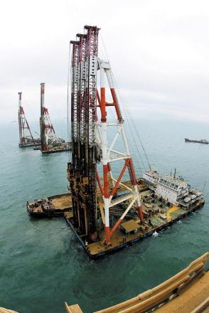 跨海桥梁的建设离不开打桩船。