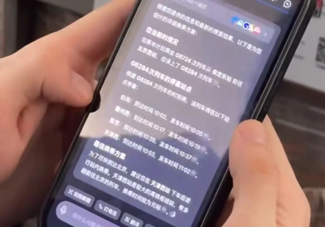 原来,这位外国旅客原本打算在保定东站乘G6724次列车前往北京西站,一不小心登上了开车时间相近、却开往天津方向的G6284次列车。途中,他淡定使用AI获取正确方向的乘车方案。