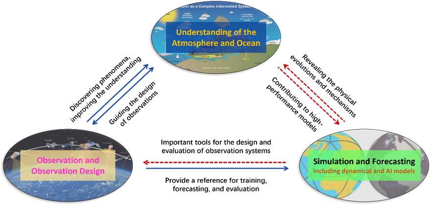 1月,大气与海洋科学系穆穆院士团队以“The Predictability Study of Weather and Climate Events Related to Artificial Intelligence Models”为题发表观点性文章,文章发表于Advances in Atmospheric Sciences期刊,穆穆院士为第一作者,戴国锟副教授为合作作者。天气与气候事件的可预报性研究聚焦于厘清产生预报不确定性的原因和机制,在此基础上,给出减小预报不确定性的方法和途径。在大数据时代,人工智能(AI)气象大模型涌现。从现有评估来看,AI大模型较传统数值模式的预报技巧有一定程度的提升。在此背景下,穆穆院士研究指出,除了需要长期持续地评估AI模型预报误差以更加客观地了解其预报技巧外,也应该大力开展基于AI模型的可预报性问题研究。目前开展AI模型可预报性研究还存在AI模型的结果缺乏物理可解释性的障碍。因此,在开展基于AI模型的可预报性问题研究时,应首先关注AI模型对所研究现象的过程模拟能力,至少应与数值模式保持一致。几十年来,动力数值模式在大气海洋科学的研究中扮演着极其重要的角色,数值模拟成为了理论研究与观测试验之外的第三种研究范式,可以指导观测网络的构建,并提高对大气海洋现象的认知。然而除了开展预报,AI模型并没有对观测系统的构建与天气气候现象的认知提供正向的反馈,如图中的红色虚线所示。“AI for forecasts”仍是当前绝大多数研究的核心。基于AI模型的可预报性问题研究可驱动“big data”向“big and better data”的转型,以真正做到“AI for science”。
