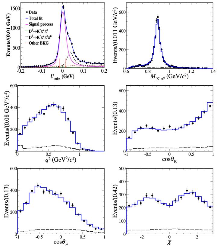 图1.实验中观测到的D0→K*(892)−μ+νμ候选事例对应的拟合图,以及对应的振幅分析中五个动力学变量的投影分布图。带误差棒的点表示数据,蓝色线表示拟合结果,虚线表示本底的贡献