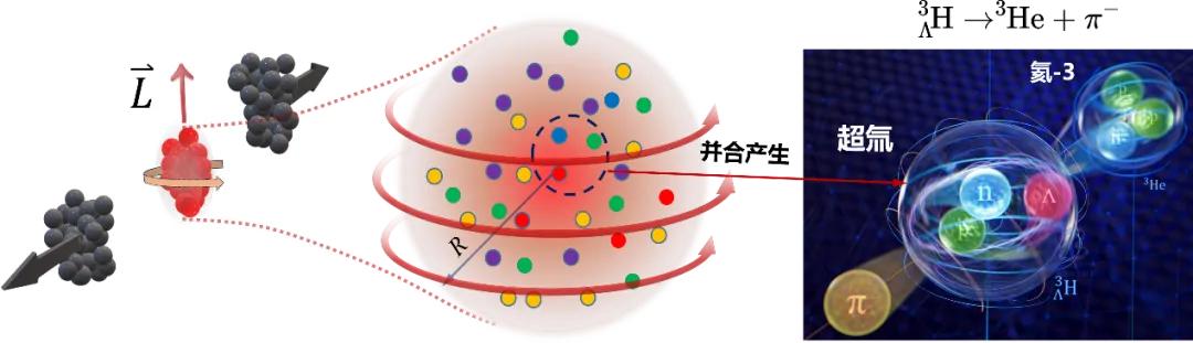 图2 超氚核的并合产生、自旋极化与两体衰变与两体衰变示意图