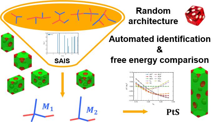 2024年12月底,高分子科学系刘一新课题组首次实现在以链结构为变量的参数空间中搜索有序相,并成功确定硫化铂(PtS)球状相是AB类多嵌段共聚物熔体中的一种新稳定相,在Communications Materials上发表了题为“Automated chain architecture screening for discovery of block copolymer assembly with graph enhanced self-consistent field theory”的研究论文。团队基于链拓扑结构的图论表示,开发了能够在线变换链结构的自洽场方法(Self-Consistent Field Theory, SCFT)数值计算方法,能够在以链结构为参数的高维度空间内随机取点进行计算。计算结果通过该团队之前开发的基于散射原理的自动识别方法进行识别(DOI: 10.1007/s10118-024-3084-x)以确保自由能对比的准确性。从而实现了随机链结构——平均场自由能对比——寻找稳定相的自动化流程。在AB型多嵌段共聚物熔体中,以PtS,TiO2,Cu2O和SnI4 为目标相,自动搜索了大约6000个分子后,确认了PtS这种新相的存在。